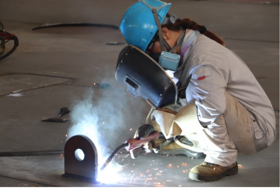 在造船厂闷热的车间里,焊工作业人员手持电焊枪,低头认真焊接钢板。电焊枪喷出的火焰仿佛能把周围的空气点燃起来,作业人员的胳膊、脸上已经被高温烤得泛红,甚至有些脱皮,汗液透过厚重的防护服渗了出来。
