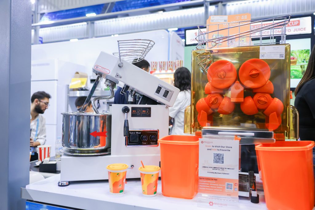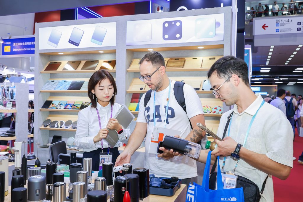 加工机械设备展区推出的苹果汁自动贩卖机、榨汁机、制冰机等,凭借新颖的设计与便捷的操作,开展首日便吸引一名南非客户现场下单。家用电器展区则按照不同色系与材质,对拳头产品咖啡磨、奶泡棒、咖啡秤、便携式咖啡机等进行分区陈列,丰富的产品线致力于让客户一站式购齐,受到众多境外采购商的青睐。此外,公司自主研发的一款新品手机壳在本次展会上首次亮相,该产品已获得欧盟外观专利,出口韩国仅7个月已热销超过100万件。