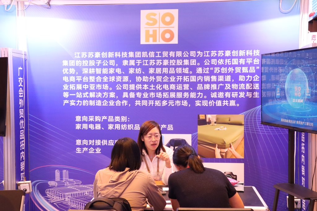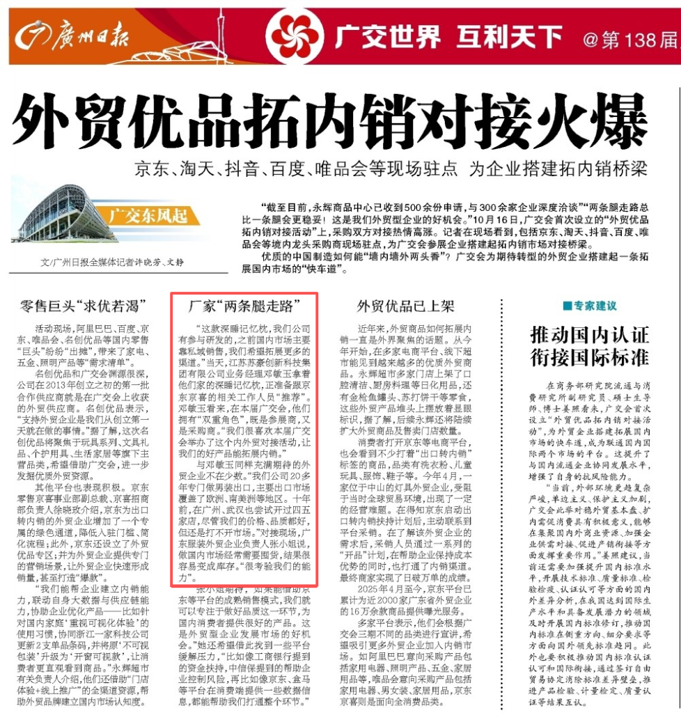 公司积极参加广交会首届外贸优品拓内销对接活动,申报驻点展位,充当起“参展商”与“采购商”双重角色,在参会前精准发布采购需求,深入研究参展企业名录,预先锁定优质供应商目标,提高对接效率,现场匹配到京东、得物等多家优质平台,并获得广州日报的采访与报道,既为“苏创外贸甄品”平台以及国外跨境电商平台提供可靠的供应链支持,更是为公司业务模式的创新注入了强劲动力。