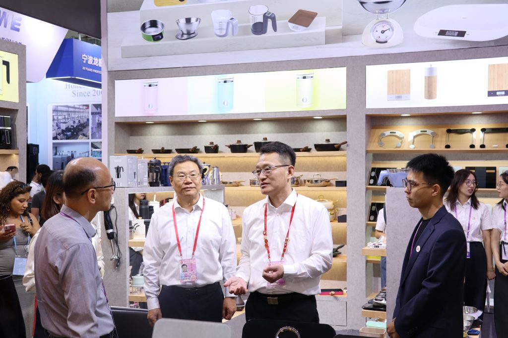 展会期间,苏豪控股集团副总裁丁海一行走访公司工具、家电、五金、加工机械设备等展位,与企业负责人就产品研发、订单出运、当前外贸形势及本届参展情况等展开深入交流。他勉励企业积极应对国际经贸新形势,推出更多具有核心竞争力和符合市场需求的产品,打造差异化竞争优势,以广交会为契机持续加快出海步伐,提升出海质量,构建全球合作网络。